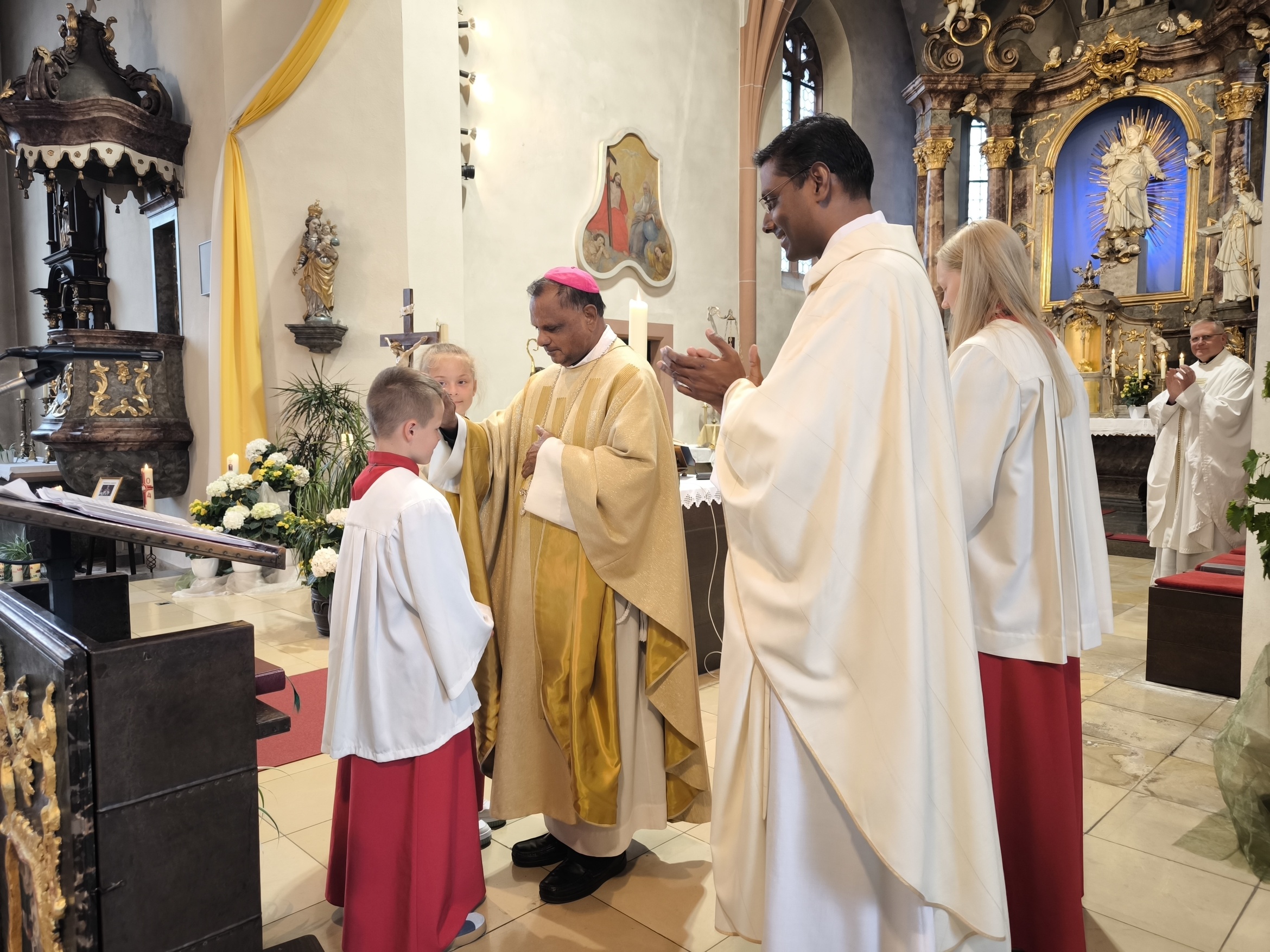 Aufgrund des bischöflichen Besuchs war nicht nur Kaplan Napoleon Savariraj als Konzelebrant bei der Heiligen Messe dabei, sondern auch Pfarrer Frank Mathiowetz, der ebenfalls „seine“ neuen Messdiener herzlich begrüßte und alles Gute wünschte.