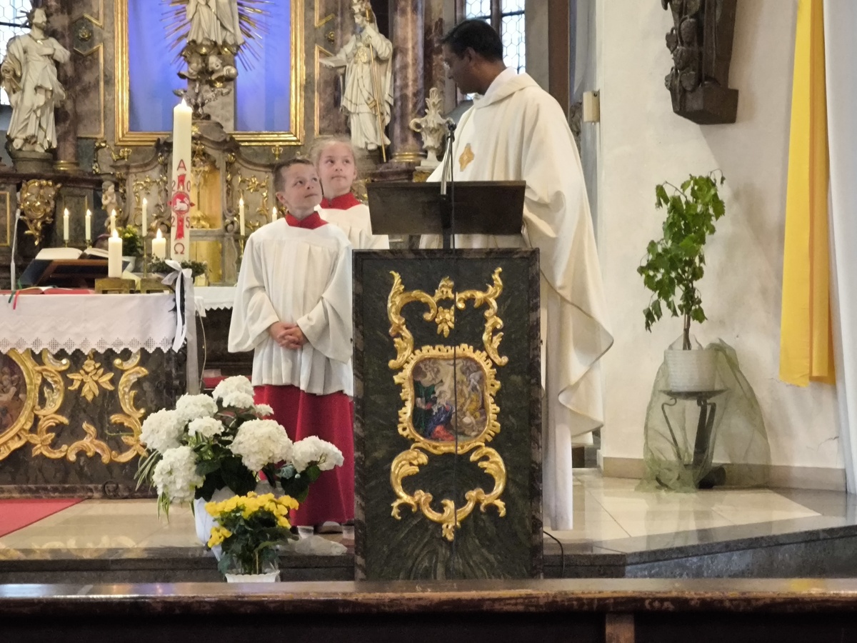 Freilich waren die neuen „Minis“ gleich aktiv in der Eucharistie eingesetzt. Gemeinsam trugen sie die Leuchter. Lenja reichte der Gemeinde zur Gabenbereitung den Klingelbeutel, Liam brachte die Gaben zum Altar. Stets an ihrer Seite waren die Oberministrantinnen Linda und Felizitas.