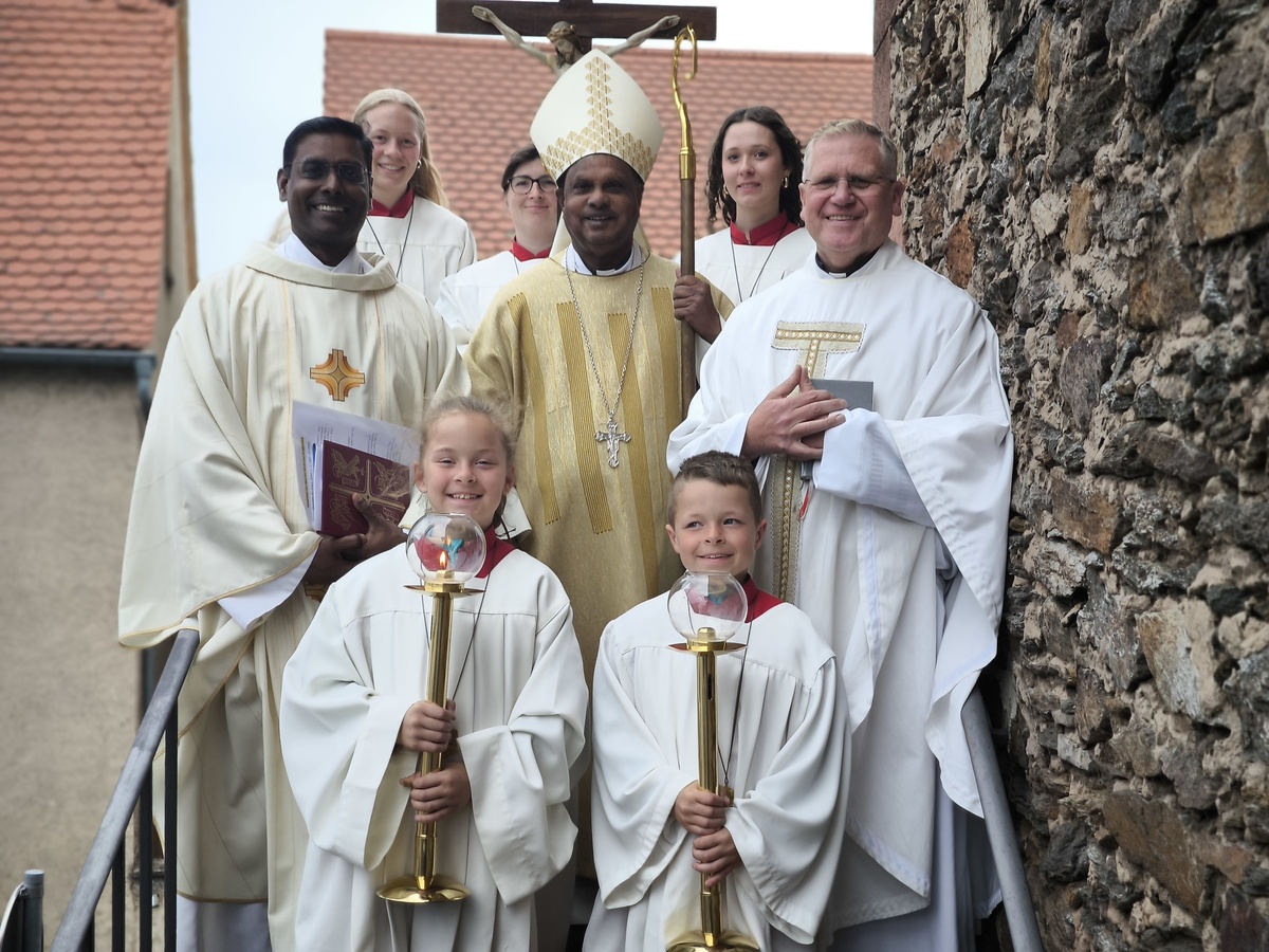 Nach dem Gottesdienst fand noch eine Begegnung der Gemeinde mit Bischof Dr. Peter Abir im Pfarrheim St. Martin statt. Auch die neuen Messdiener und Oberministrantinnen waren noch mitgekommen. Dabei durften Erinnerungsfotos mit Bischof Abir nicht fehlen, der in wenigen Tagen wieder nach Indien reist, um seinen Aufgaben als Bischof von Sultanpet nachzugehen.